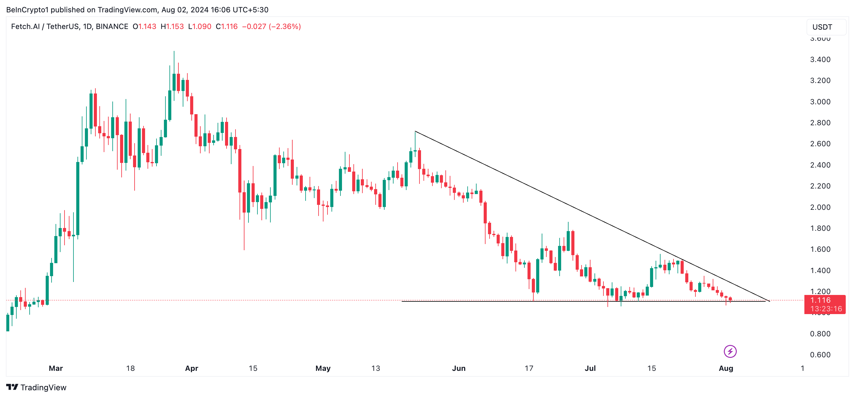• Artificial Superintelligence Alliance (FET) zit sinds mei in een consistente neerwaartse trend en vormt een dalend driehoekpatroon.