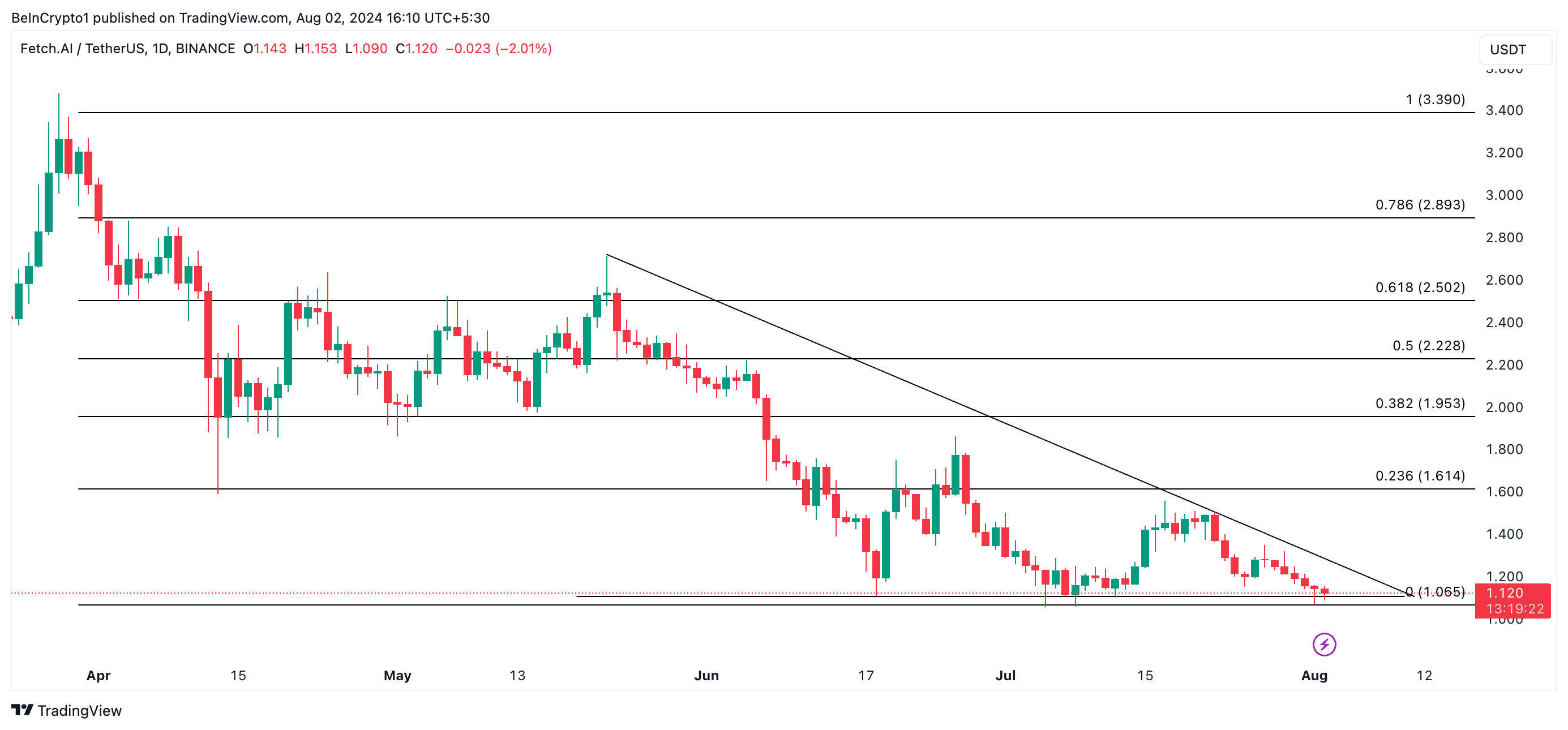 Sinds de neerwaartse trend begon op 22 mei, heeft FET zich binnen een dalende driehoek bewogen. Dit patroon verschijnt wanneer de koers van een activum een reeks lagere hoogtepunten en een horizontaal steunniveau vormt. Het bevestigt dat de bearish trend zal voortzetten zodra de koers onder het horizontale steunniveau breekt.