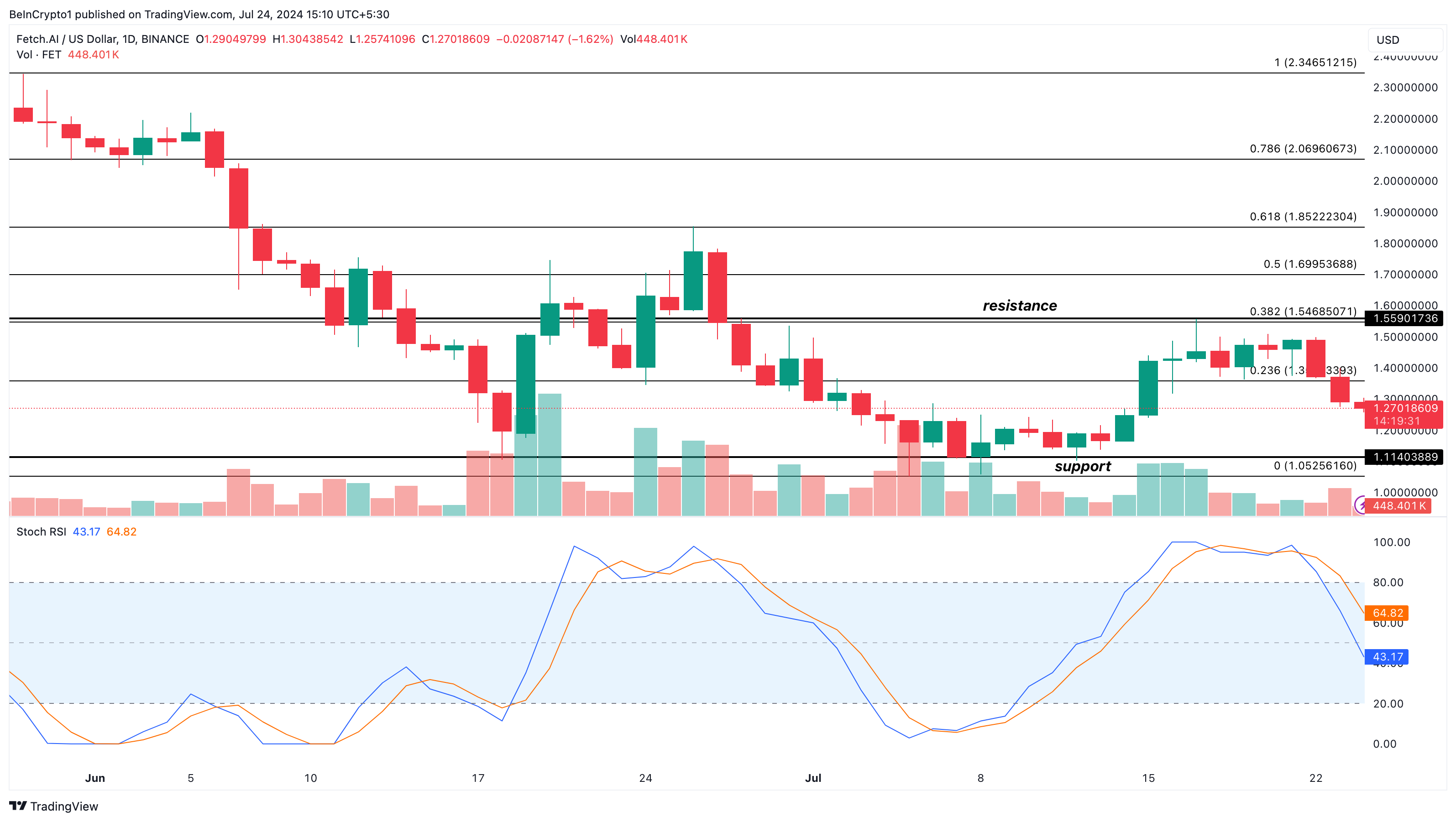 Ondanks de verandering in perceptie, schildert het technische perspectief FET niet bepaald in een bullish licht. Om te beginnen is de Stochastic Relative Strength Index, beter bekend als de Stoch RSI, gedaald.