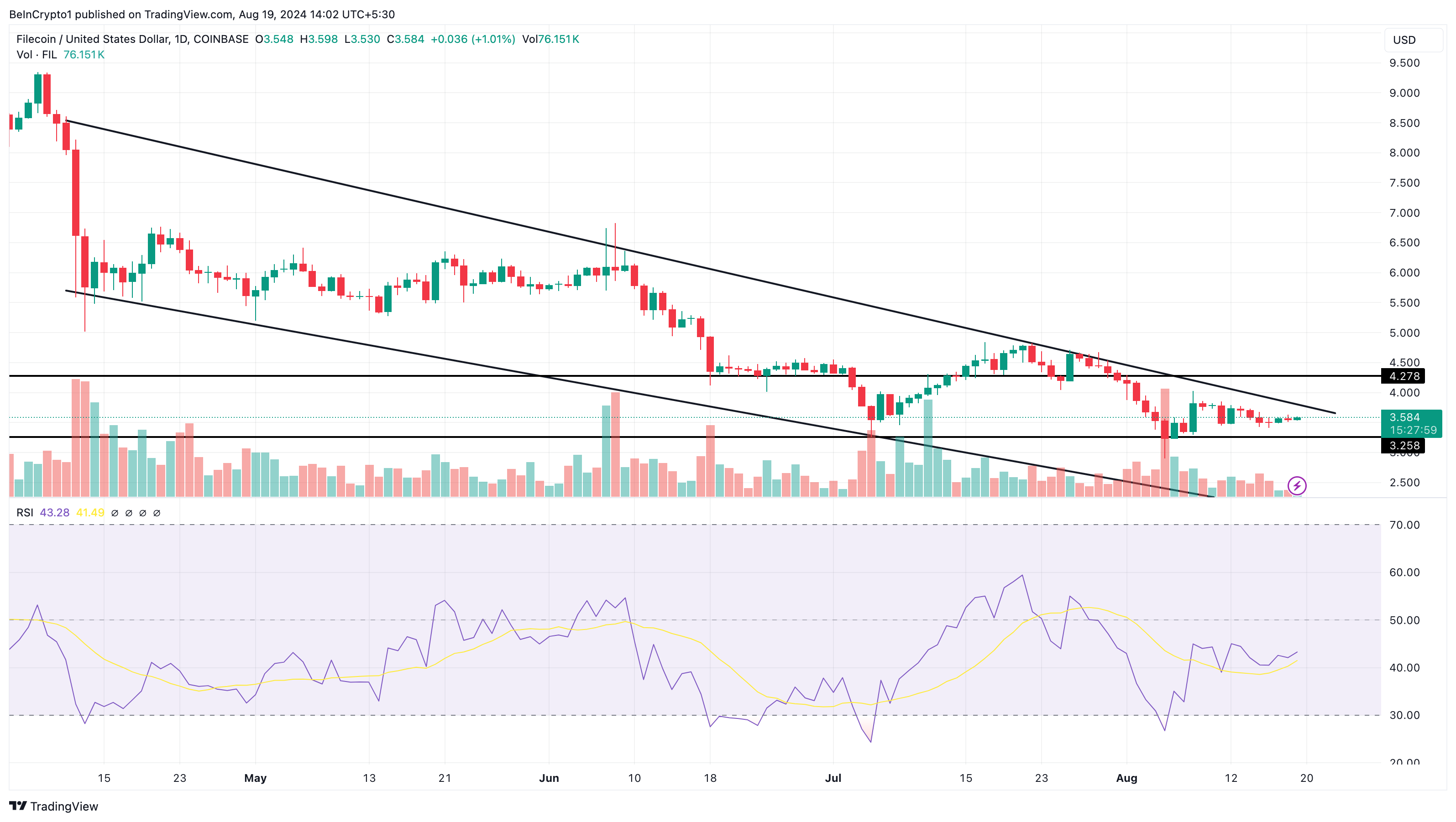 Op basis van de dagelijkse FIL/USD-grafiek beweegt de token sinds april binnen een dalend kanaal, wat een bearish trend aangeeft. Dit patroon wordt gekenmerkt door twee neerwaartse trendlijnen: de bovenste fungeert als weerstand, terwijl de onderste als steun dient tijdens de fasen van correctie en consolidatie.