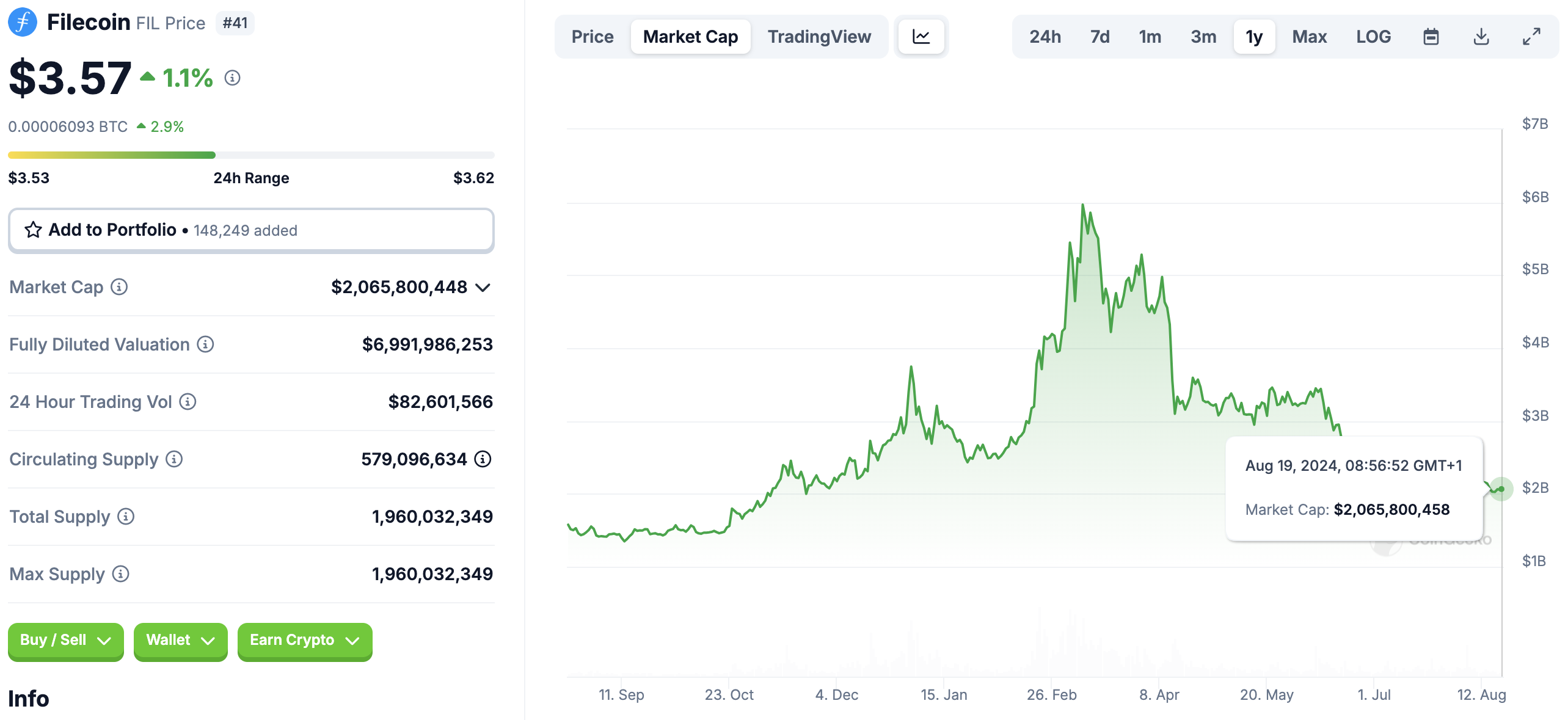 Ondanks het sombere vooruitzicht, blijft Filecoin het meest waardevolle DePIN-project in termen van marktkapitalisatie. Volgens gegevens van CoinGecko is de marktkapitalisatie van FIL $2,06 miljard.