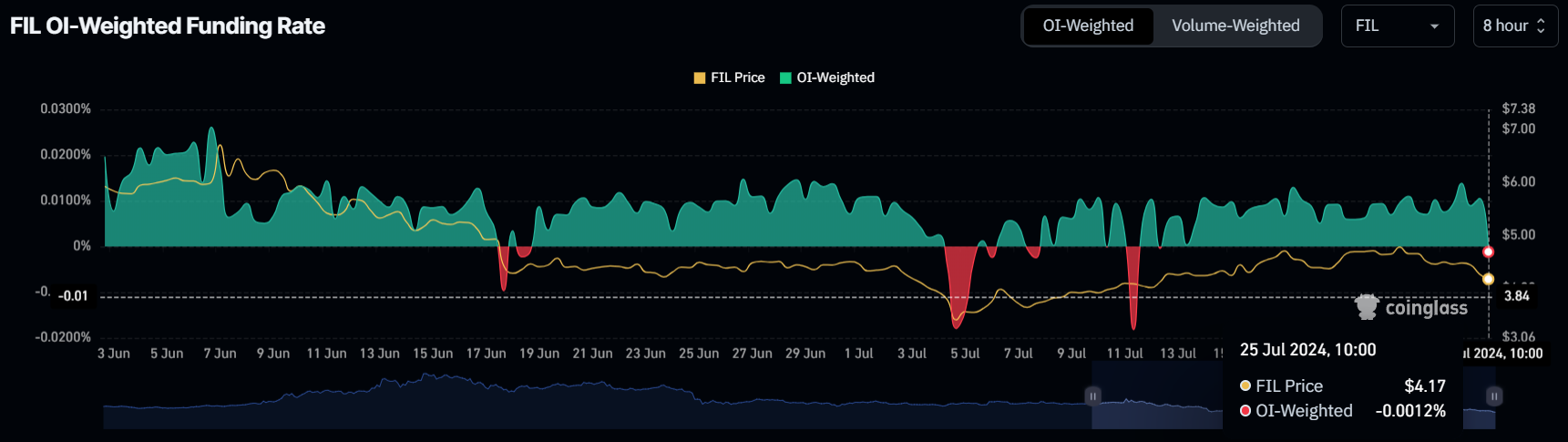 Bovendien onderstreept de verschuiving in de funding rate van FIL, die voor het eerst in twee weken negatief is geworden, de bearish vooruitzichten van de markt. Deze plotselinge verandering is een sterke indicator voor de verwachtingen van investeerders.