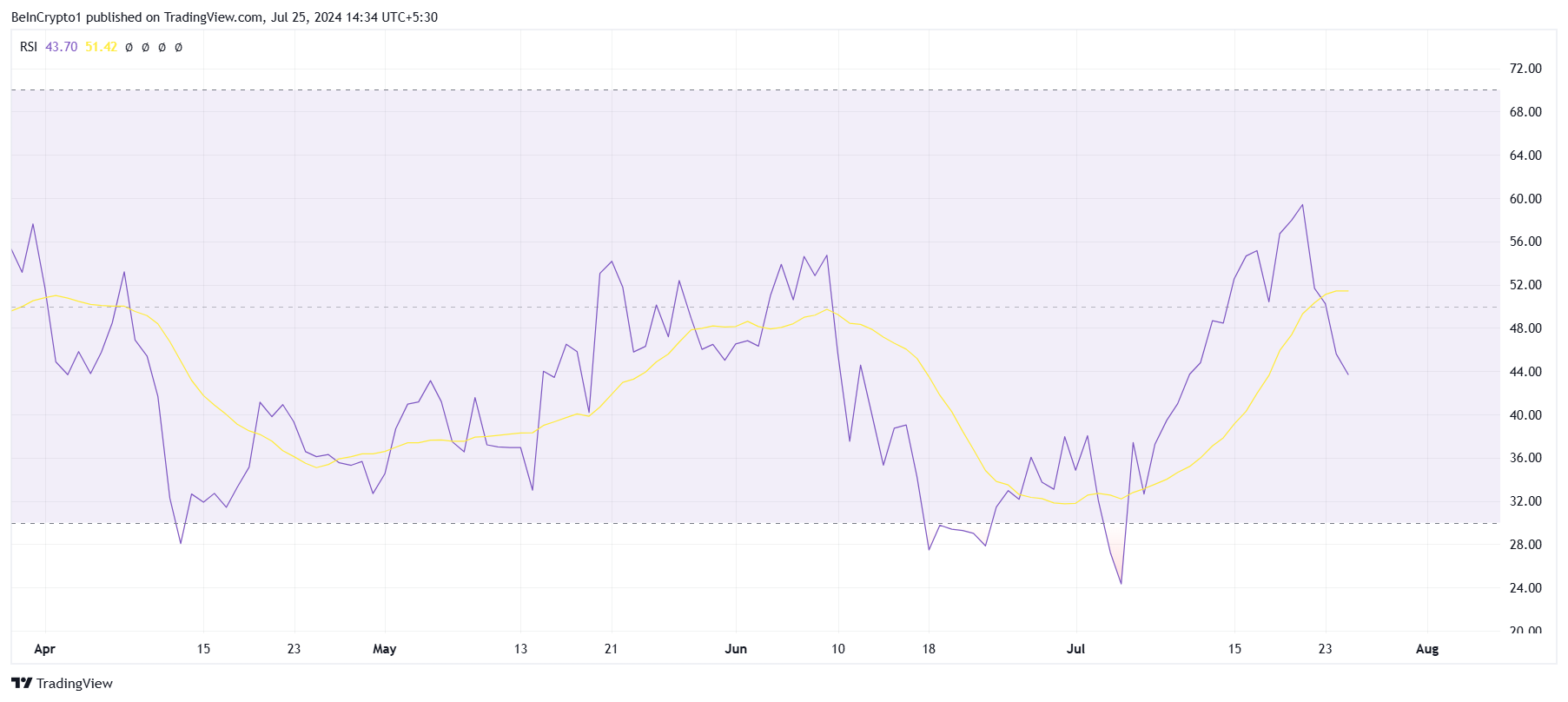 De RSI geeft aan dat het toenemende bearish sentiment in de bredere markt de verkoopdruk heeft versterkt. Dit blijkt duidelijk uit het feit dat de RSI scherp is gedaald tot onder de neutrale lijn na consistente upticks.