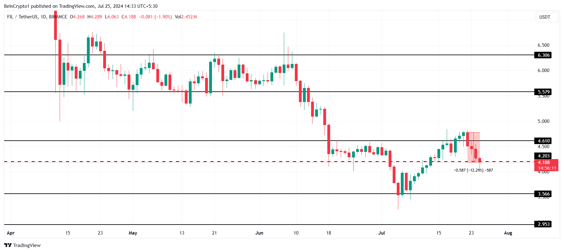 De Filecoin koers is de afgelopen vier dagen met 12% gedaald, ondanks het doorbreken van een belangrijke barrière van $4,6 eerder deze week. De altcoin wordt momenteel verhandeld op $4,1, is onder de steun van $4,2 en komt dichter bij $4,0.