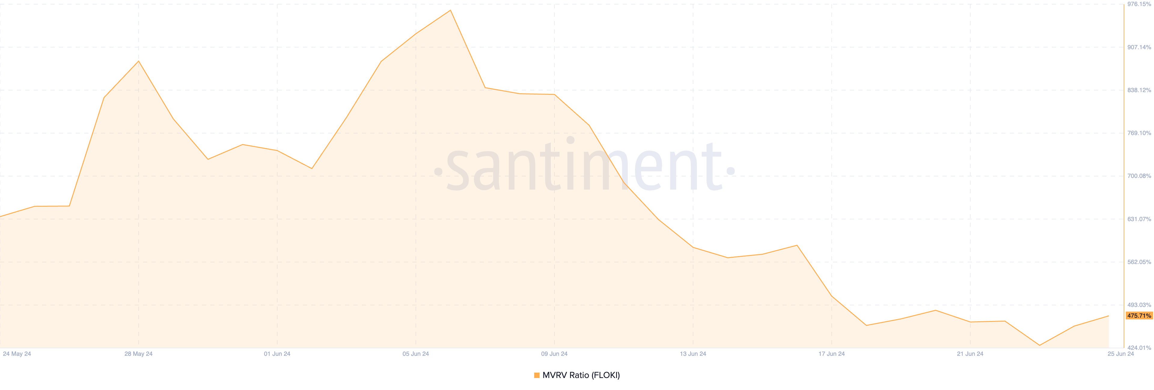 Op het moment van schrijven is de MVRV-ratio van FLOKI 475,71%. Tegen deze waarde hebben de houders van de meme coins momenteel posities die vier keer hun initiële investering waard zijn.