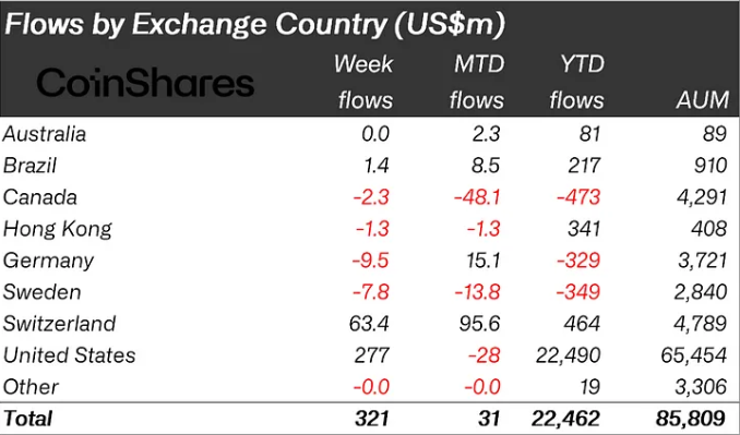 Volgens het laatste CoinShares-rapport speelde de beslissing van de Federal Reserve om de rente met 50 basispunten te verlagen vorige week een sleutelrol in het stimuleren van deze instromen. De VS leidde regionale instromen, met een bijdrage van $277 miljoen aan het totaal. Deze reactie op de renteverlaging van de Fed benadrukt de groeiende impact van monetair beleid op crypto-investeringen.