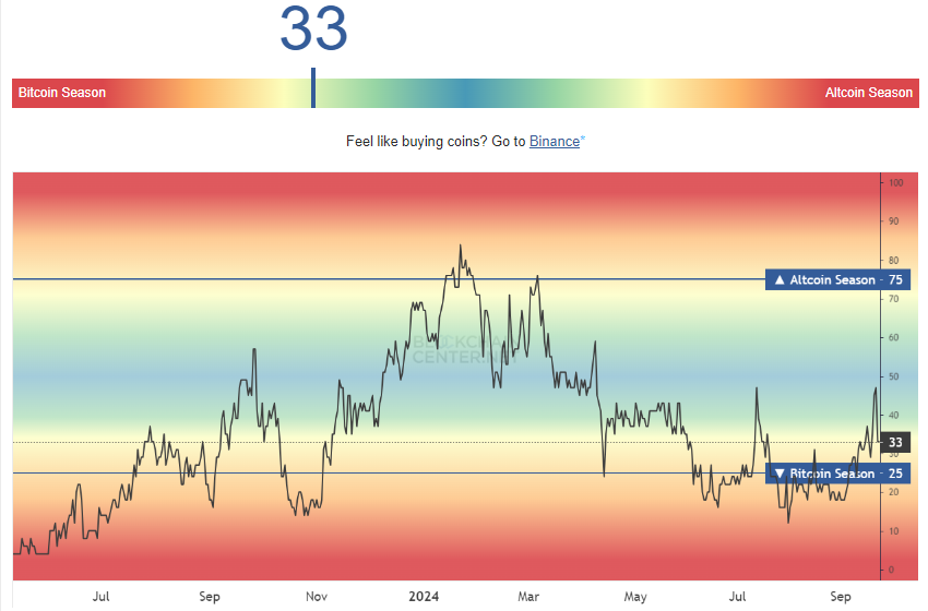 Het verwachte “altcoin-seizoen” blijft uit, een fase waarin investeren in altcoins doorgaans betere rendementen oplevert dan Bitcoin of Ethereum. Volgens de Altcoin Season Index bevindt de markt zich nog steeds in een Bitcoin-seizoen, met een score van 33/100. Dit geeft aan dat Bitcoin blijft domineren, hoewel altcoins langzaam terrein winnen.