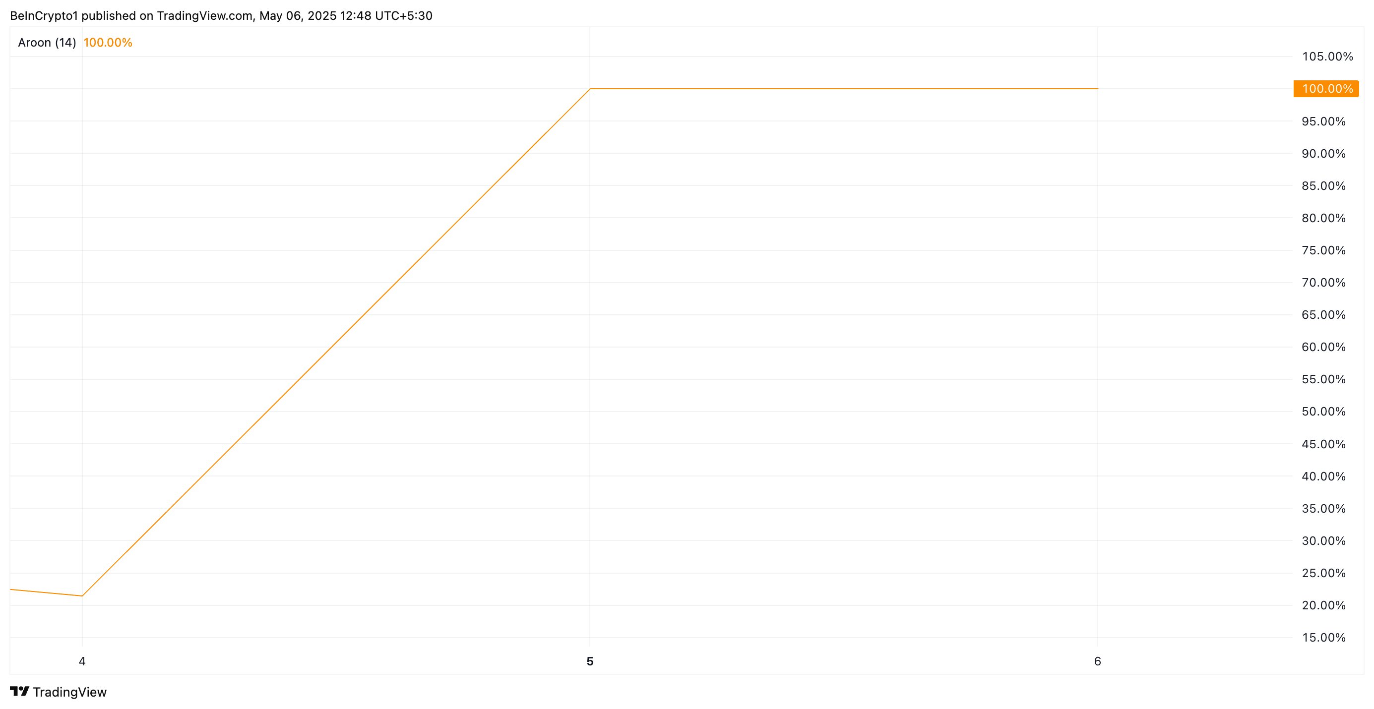 De Aroon-indicator meet de sterkte en richting van de trend van een crypto door de tijd sinds de hoogste en laagste koersen over een bepaalde periode te volgen. Het bestaat uit twee lijnen: Aroon Up, die bullish momentum meet, en Aroon Down, die bearish druk volgt.