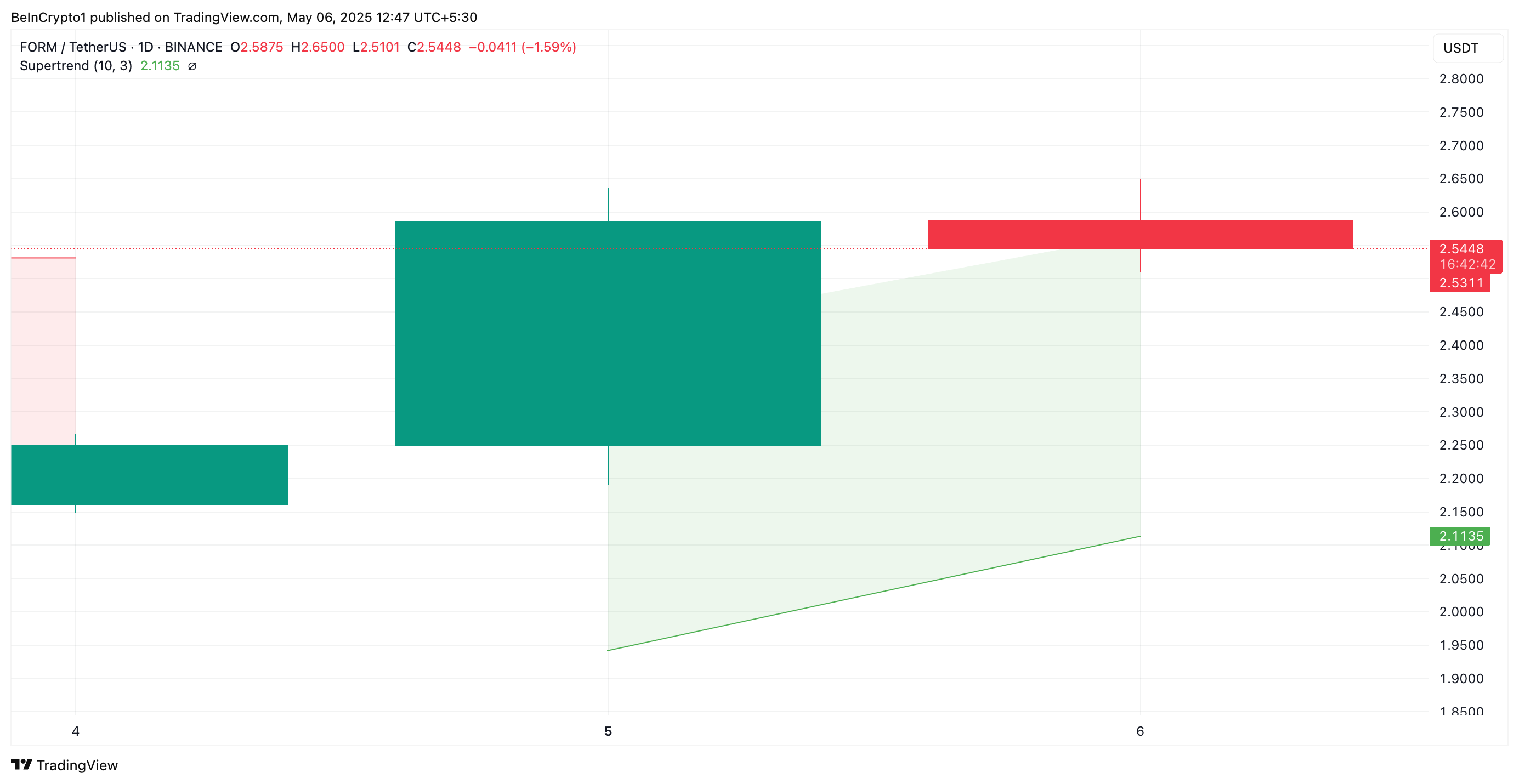 Voor FORM coin biedt de Supertrend-indicator sterke dynamische steun op het niveau van $2,11, wat standhoudt tegen koersdalingen en het potentieel voor aanhoudende winsten versterkt.