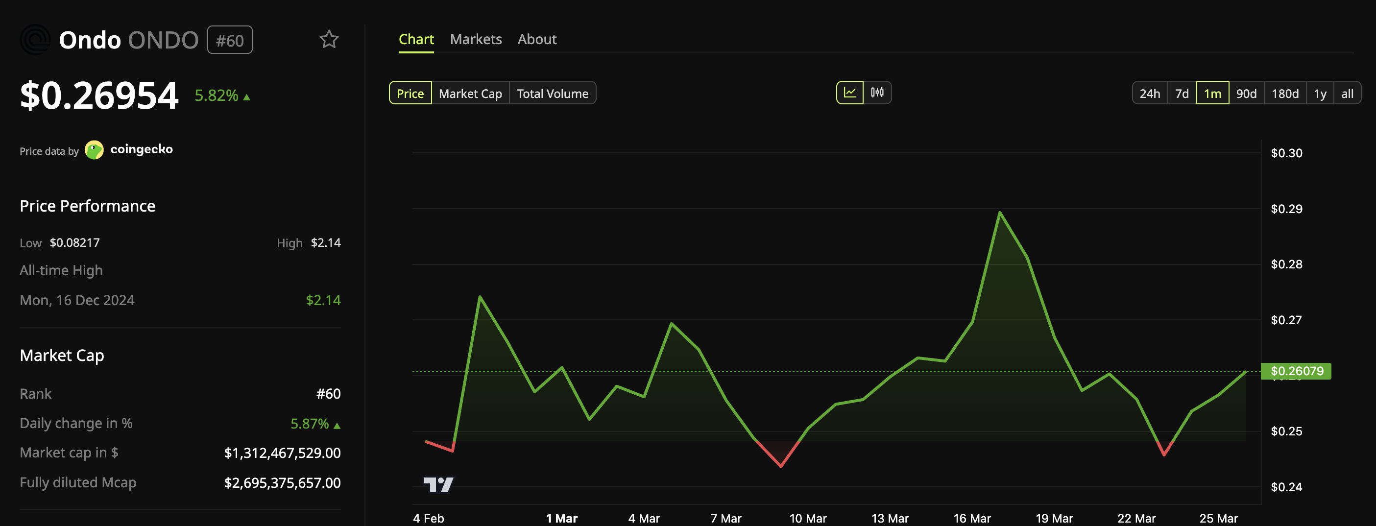 Opvallend is dat dit nieuws ook een positieve invloed had op de koers. Volgens BeInCrypto Markten steeg ONDO in 24 uur bijna 6%, duidelijk meer dan de bredere markt (0,5%). Op het moment van schrijven wordt de altcoin verhandeld rond $0,26.
