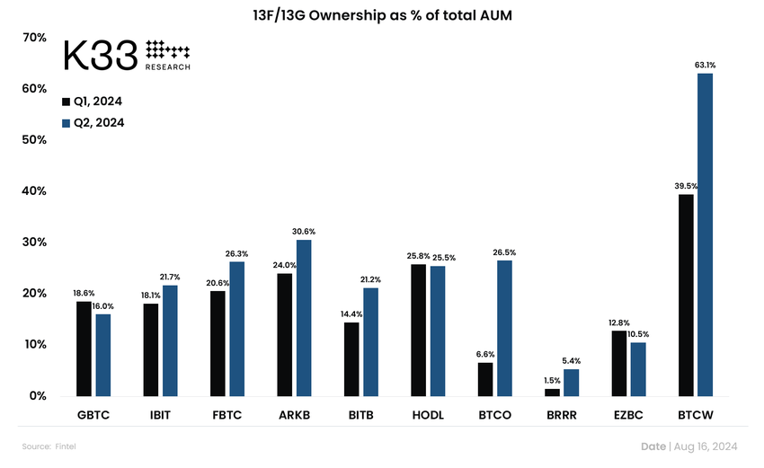Hoewel particuliere investeerders nog steeds het grootste deel van de markt in handen hebben, hebben institutionele investeerders hun aandelen met 2,41% van hun Beheerd Vermogen (AUM) verhoogd. Ondanks enige vermindering van de blootstelling blijven bedrijven zoals Millennium en Susquehanna de grootste houders van spot Bitcoin ETF’s. Nieuwe deelnemers zoals Jane Street en Paul Tudor Jones maakten ook opmerkelijke Bitcoin ETF-investeringen tijdens deze periode.