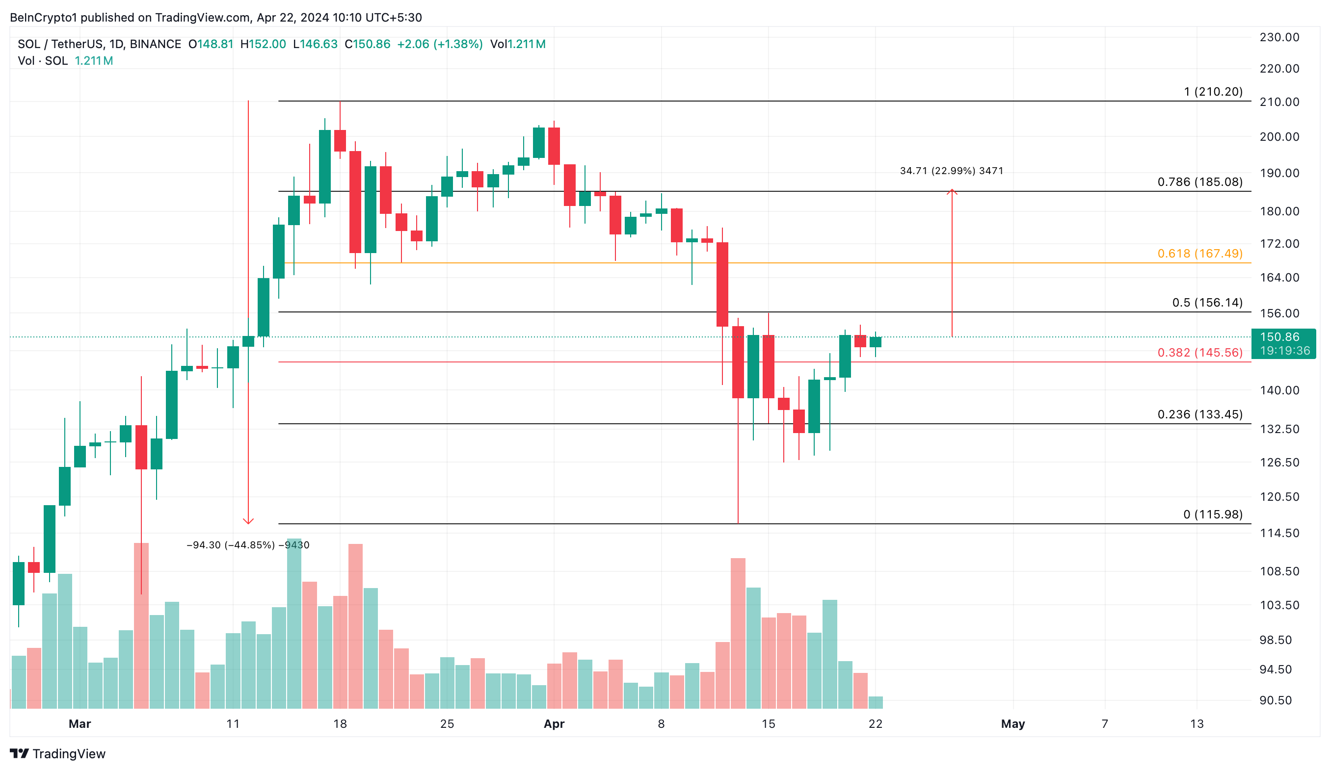 Op dit moment is de Solana koers mogelijk aan het stijgen. Na het bereiken van een high van $210 op 18 maart, daalde de koers van Solana sterk. Het daalde met meer dan 44% en bereikte een low van ongeveer $116 op 13 april. Desondanks is de koers weer opgeveerd en handelde het bijna 30% hoger vanaf die low.