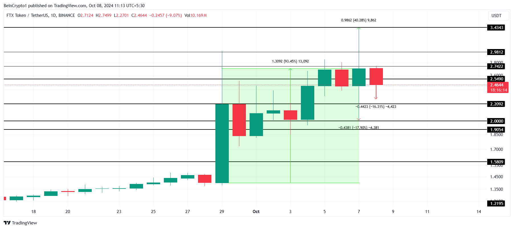In de afgelopen 12 uur is de FTT koers met 16% gedaald, waardoor de token nu verhandeld wordt voor $2,46. De koersbeweging op dinsdag, waarbij FTT intra-day met 40% steeg en daarna met 17% crashte, onderstreept de hoge volatiliteit in de markt. Dit grillige koersgedrag kan aanhouden, aangezien het sentiment van investeerders blijft fluctueren.