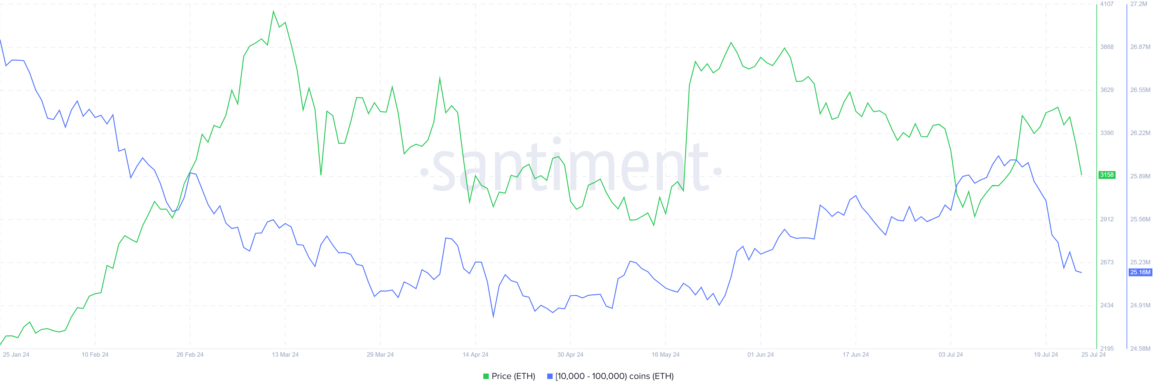 Deze beweging is niet recent, want hun verkoop is al twee weken aan de gang. Tijdens deze periode zijn ze erin geslaagd om meer dan 840.000 ETH ter waarde van iets meer dan $2,65 miljard te dumpen. De adressen die deze transacties uitvoerden hebben tussen de 10.000 en 100.000 ETH in hun bezit en hebben de neiging om de koers te beïnvloeden.