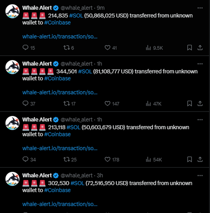 De verdenking wordt verder aangewakkerd doordat blockchain-tracking platform Whale Alert meerdere grote SOL-transacties van onbekende wallets naar de Coinbase exchange markeerde.
