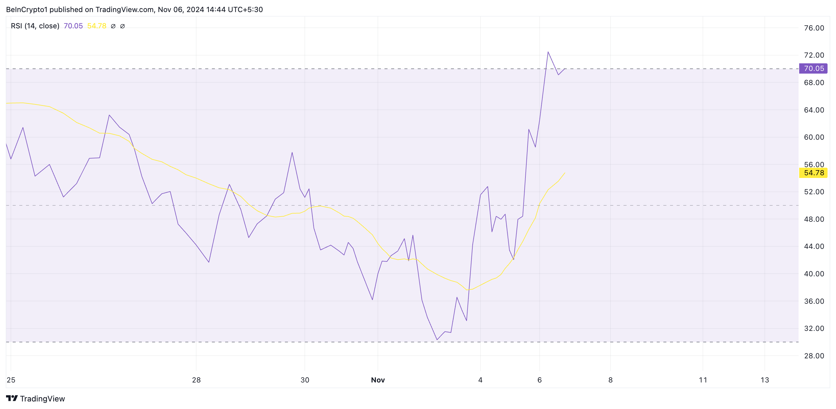 SponsoredDaarentegen geven waarden onder de 30 aan dat de cryptocurrency oversold is en mogelijk kan herstellen. De RSI-waarde van 70,05 voor GOAT wijst erop dat het overbought is en waarschijnlijk binnenkort een correctie kan verwachten.