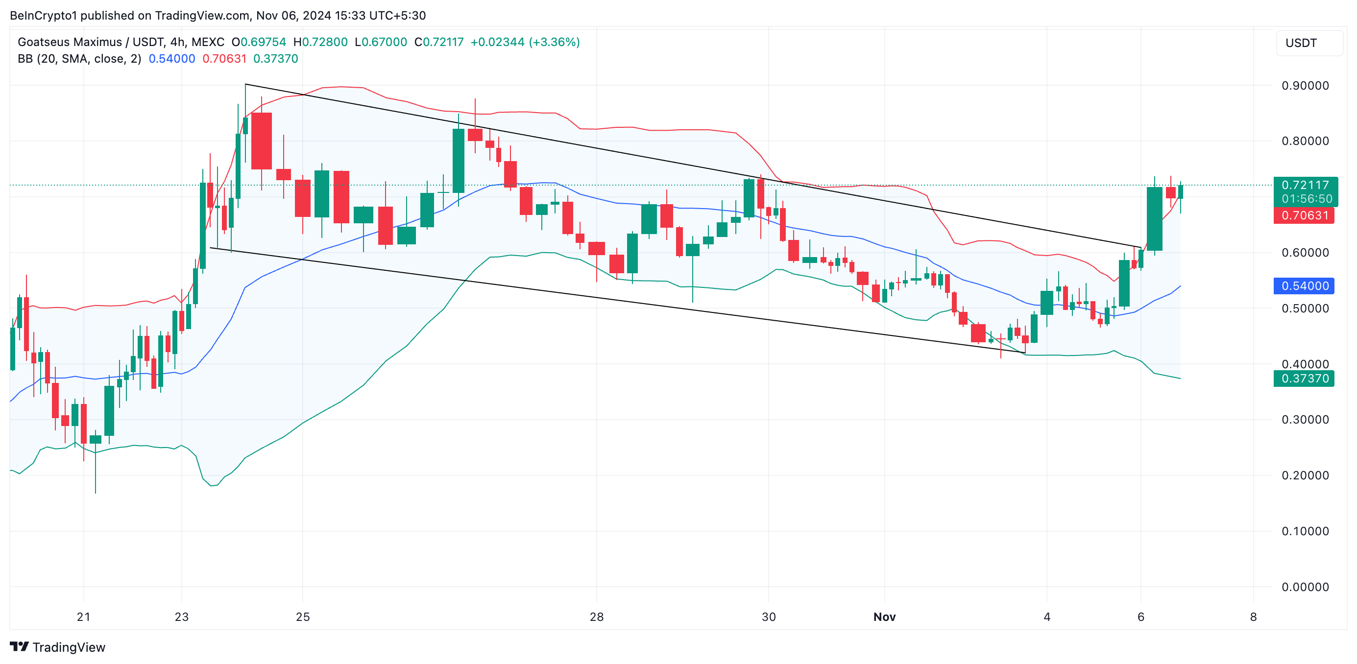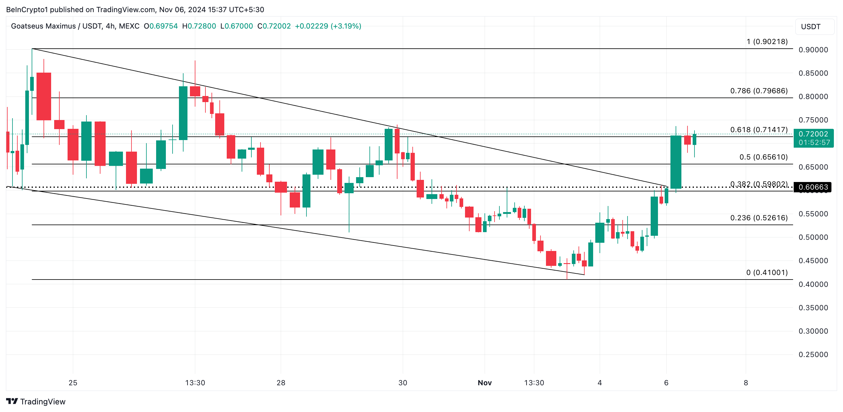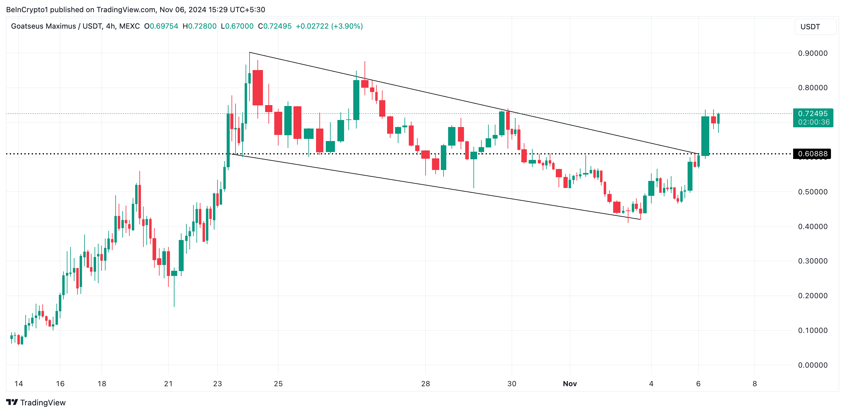 De beoordeling van BeInCrypto van de 4-uur grafiek van GOAT/USD onthult dat de meme coin boven een dalend kanaal is uitgebroken.