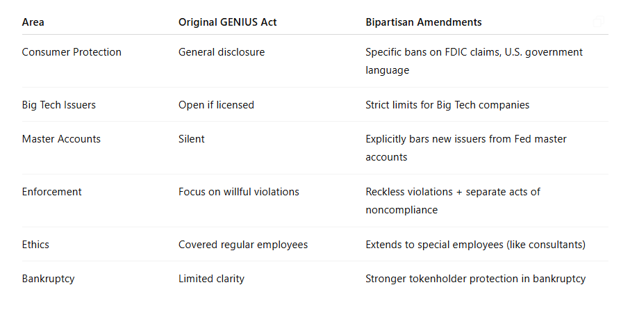 Over het algemeen vallen de GENIUS Act-amendementen langs dezelfde as: het aanpakken van de zorgen die ervoor zorgden dat het vorige week faalde. Deze omvatten het beperken van de mogelijkheden voor fraude op verschillende manieren, zoals het duidelijk maken dat deze producten geen consumentenbescherming hebben onder de FDIC of federale affiliatie.