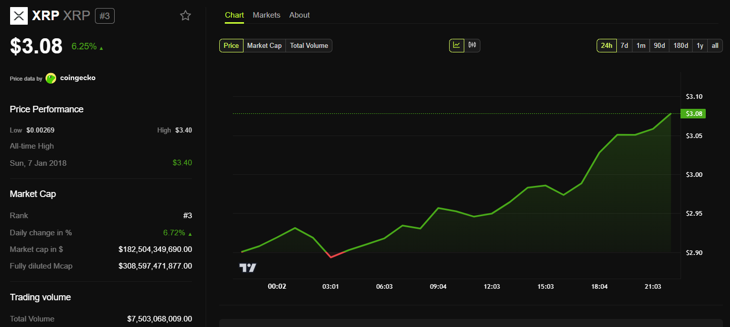 XRP koers steeg vandaag met meer dan 6% nadat het Amerikaanse Huis van Afgevaardigden de GENIUS stablecoin-wet en de CLARITY-wet had goedgekeurd. XRP kwam daarmee binnen 9% van zijn hoogste punt ooit, en de altcoin blijft zijn sterkste bewegingen in maanden maken.