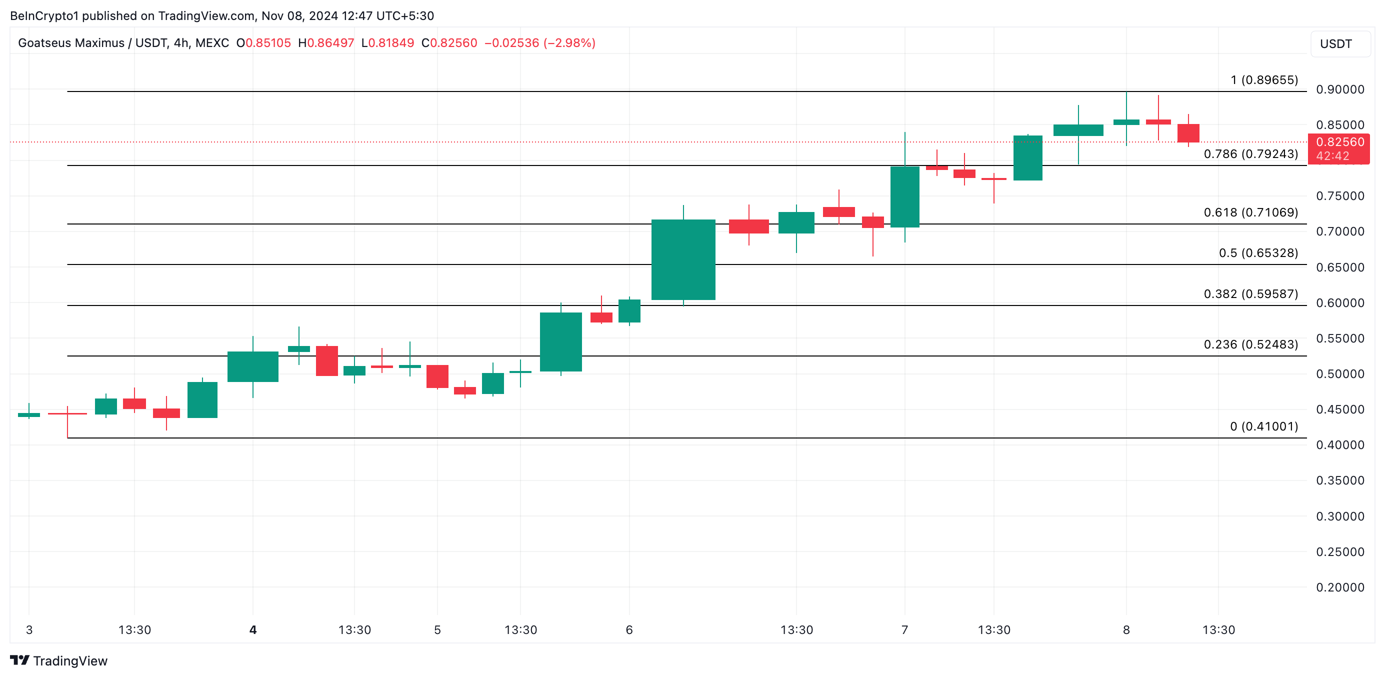 De koers van de populaire meme coin Goatseus Maximus (GOAT) steeg naar een nieuwe all-time high van $0,89 tijdens de handelssessie op donderdag. Echter, een golf van winstnemingen volgde snel, waardoor de altcoin daalde naar $0,82 op dit moment — een daling van 6% vanaf zijn piek.