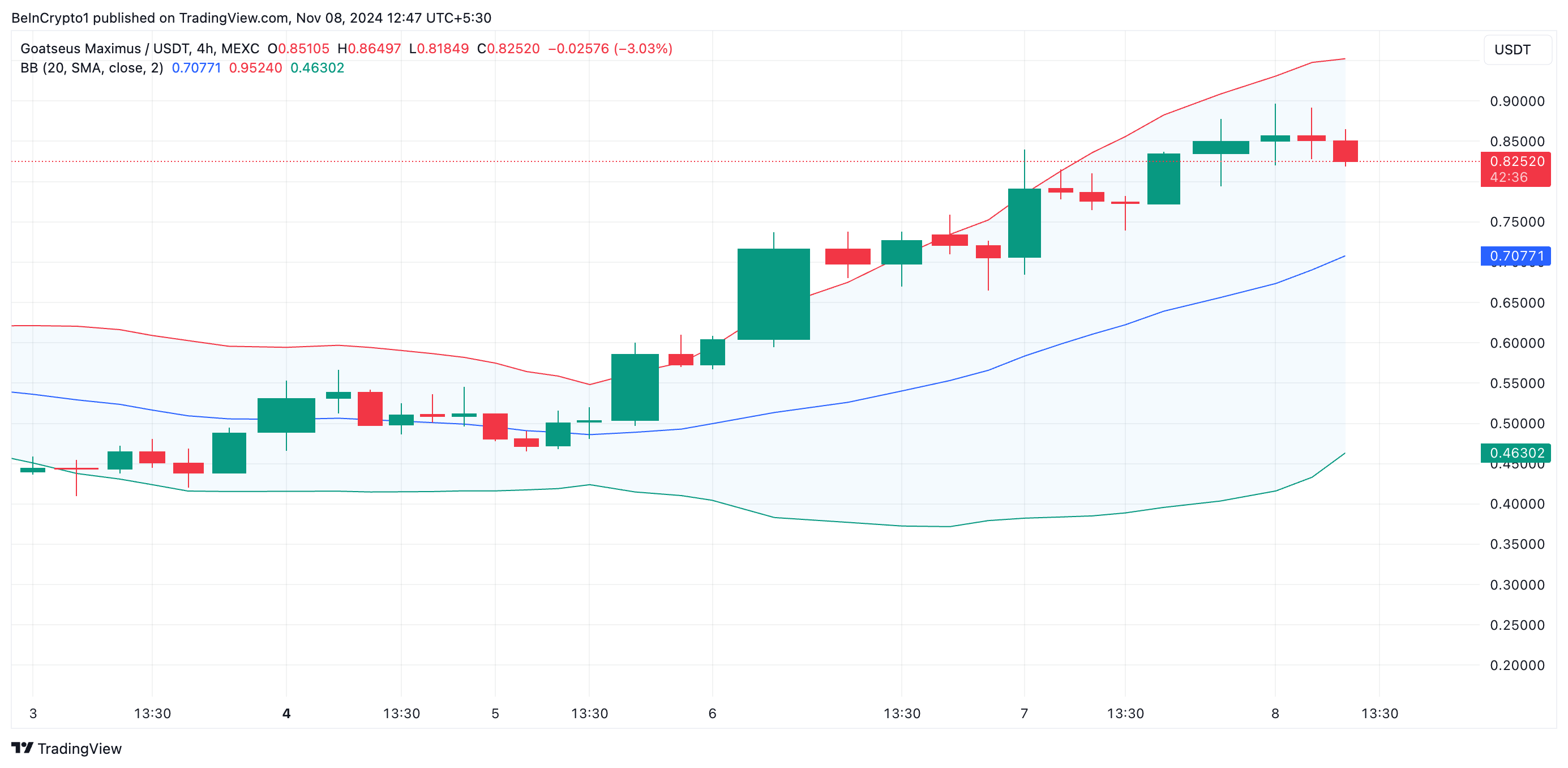 De vergrotende kloof in GOAT’s Bollinger Bands waargenomen op een vier-uurs grafiek, weerspiegelt een toename in marktvolatiliteit.