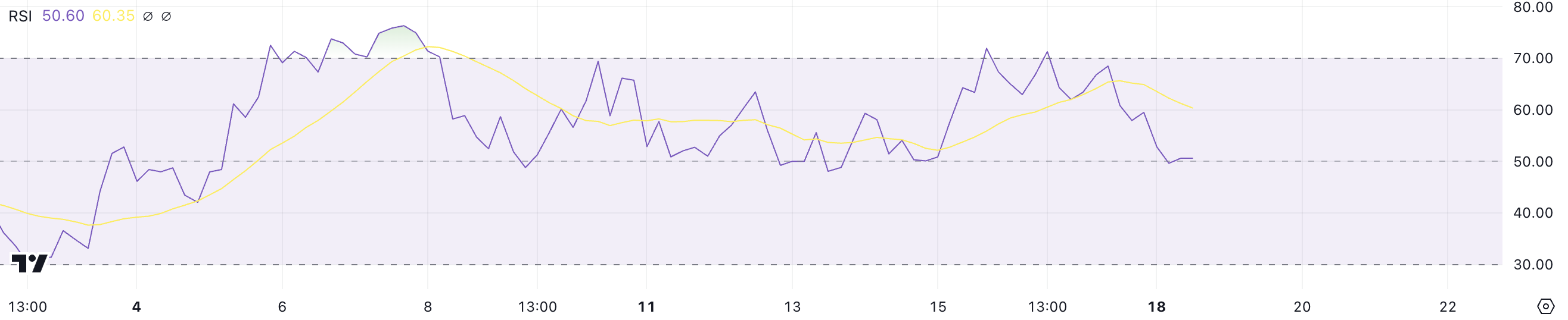 GOAT is vandaag de grootste coin ooit gelanceerd op Pumpfun, het grootste coin lanceerplatform van Solana. De RSI van GOAT is gedaald naar 50,60 van meer dan 70 een paar dagen geleden, wat wijst op een afkoeling in bullish momentum. Voorheen in het overbought-gebied boven 70, ondervond de crypto sterke opwaartse druk.