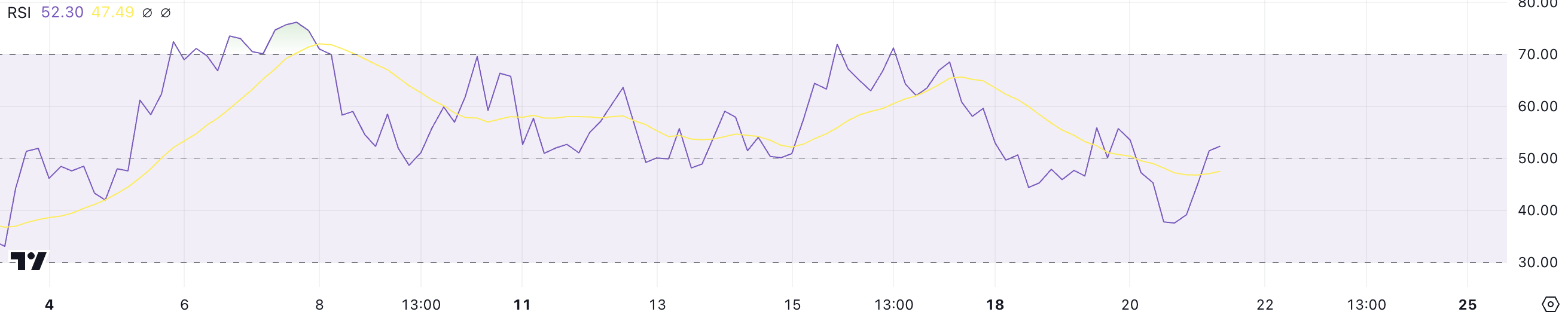 De RSI meet de kracht en snelheid van koersveranderingen, waarbij waarden boven de 70 wijzen op overbought-condities en onder de 30 op oversold-niveaus. Met een waarde van 52 bevindt GOAT’s RSI zich in een neutrale zone, zonder duidelijk bullish of bearish momentum.