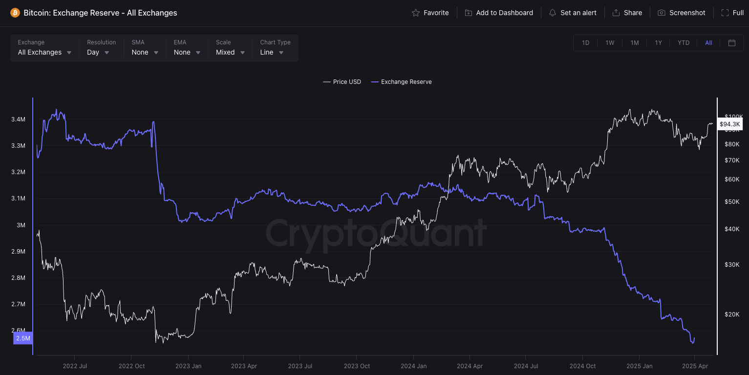 De Bitcoin-markt vertoont bemoedigende signalen nu de voorraad op gecentraliseerde exchanges (CEX) is gedaald naar een 7-jaar low. Volgens gegevens van CryptoQuant blijven er slechts ongeveer 2.492 miljoen BTC op exchanges. Dit is een scherpe daling ten opzichte van 2.488 miljoen BTC, geregistreerd op de vorige vrijdag.