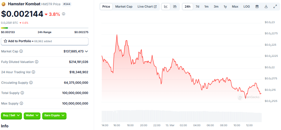 CoinGecko gegevens tonen dat Hamster Kombat’s token, HMSTR, op het moment van schrijven verhandeld werd voor $0,002144. Dit vertegenwoordigt een daling van bijna 4% in de afgelopen 24 uur.