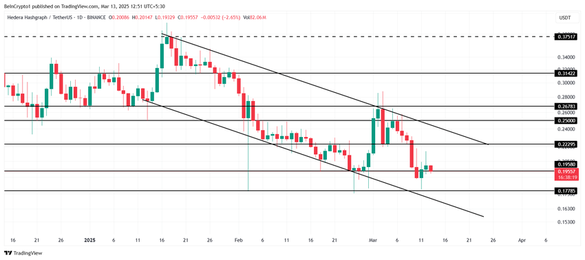 Gezien de aanhoudende marktomstandigheden is HBAR kwetsbaar voor het verliezen van de $0,195 steun. Als dit gebeurt, kan de koers dalen naar $0,177, wat de afgelopen weken een kritisch steunniveau voor HBAR is geweest. Als de koers onder dit niveau breekt, duidt dit op een voortzetting van de bearish trend en een doorbraak van het patroon, wat leidt tot verdere koersdalingen.