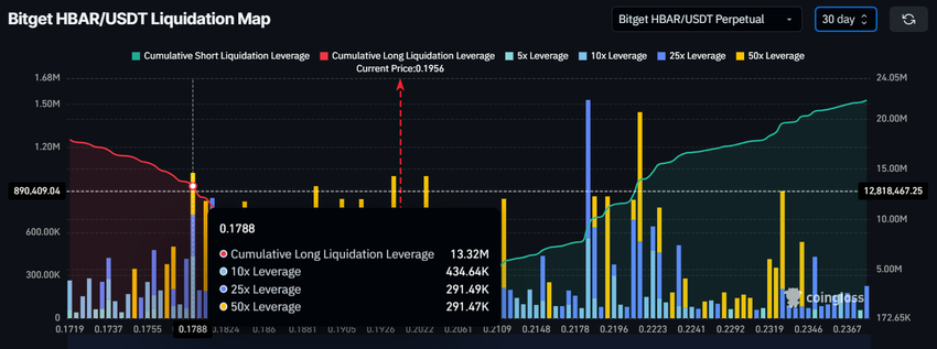 Wat betreft het macro-momentum, de liquidatiekaart toont een zorgwekkend scenario als HBAR zijn neerwaartse trend voortzet. Als de koers daalt naar het kritieke steunniveau van $0,177, kan dit $13,3 miljoen aan long liquidaties veroorzaken. Deze liquidatie kan het marktsentiment beïnvloeden en handelaren doen terugtrekken uit angst voor verdere verliezen.