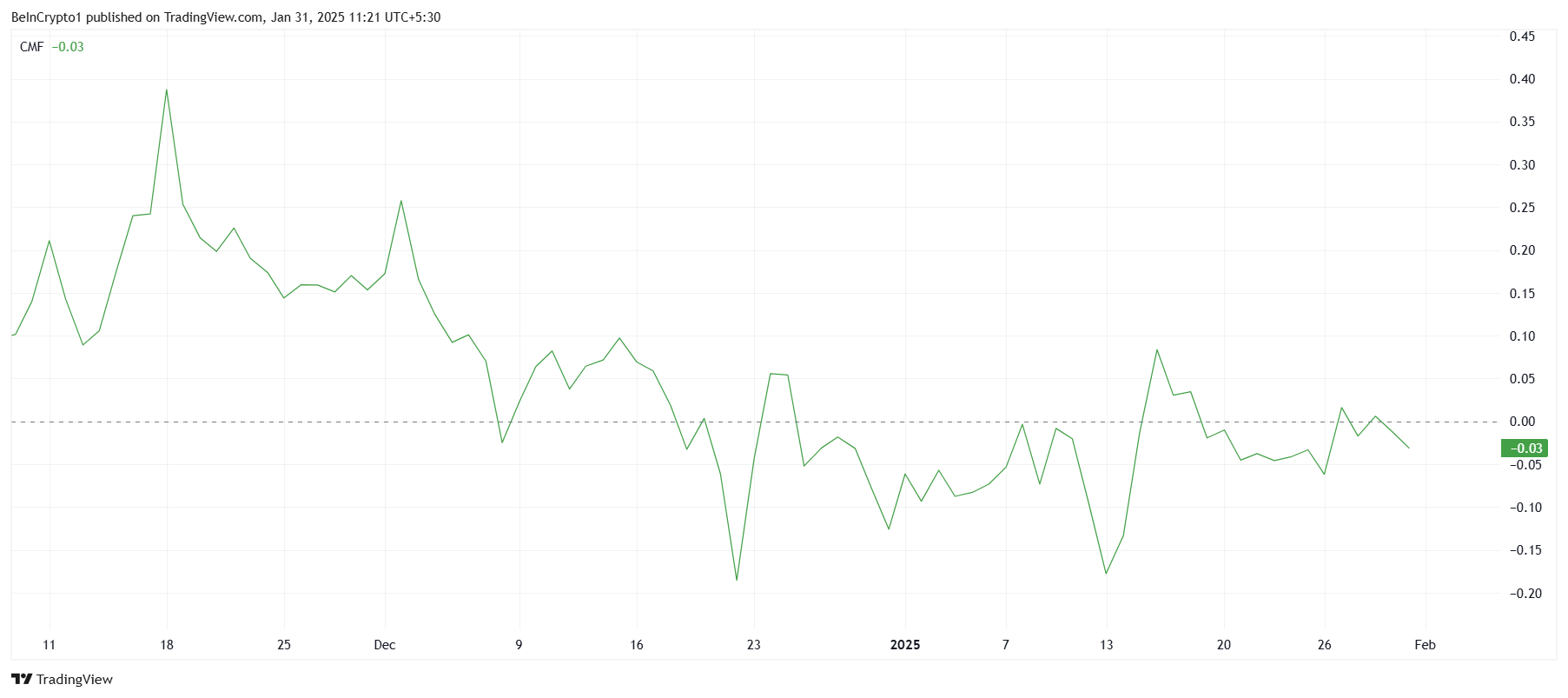 De Chaikin Money Flow (CMF) indicator toont zwakke instromen in HBAR, wat de scepsis onder investeerders versterkt. Na de mislukte uitbraakpoging blijft de indicator dicht bij de nul-lijn, wat suggereert dat er weinig nieuw kapitaal in de asset stroomt. Zonder een toename in koopactiviteit kan HBAR blijven consolideren in de huidige range.