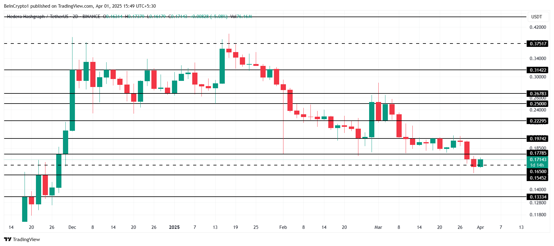 Op het moment van schrijven wordt HBAR verhandeld op $0,171, en worstelt om boven het weerstandsniveau van $0,177 uit te breken. De altcoin viel onlangs onder dit steunniveau na een mislukte poging om voorbij $0,197 te breken. Gezien de huidige marktomstandigheden loopt HBAR nu het risico onder de kritieke steun van $0,154 te zakken.