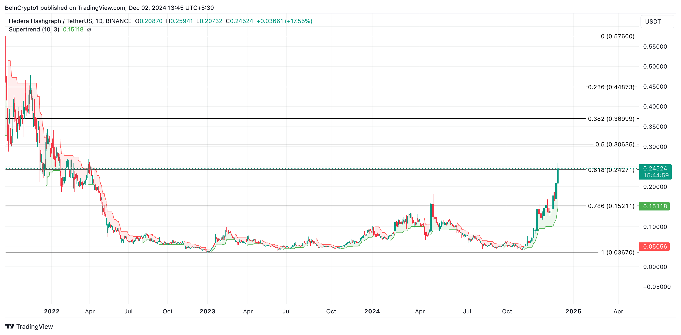 HBAR’s Super Trend-indicator op de eendaagse grafiek geeft het potentieel aan voor een aanhoudende rally. De koers bevindt zich momenteel boven de groene lijn van de indicator, wat bullish druk weerspiegelt.