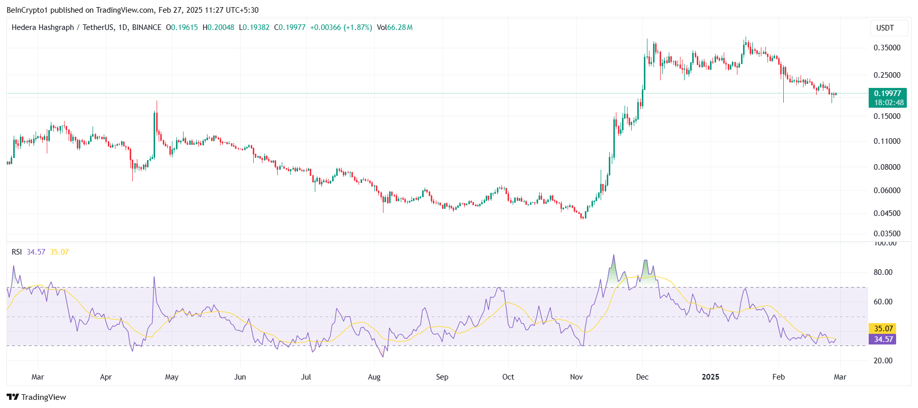 Ondanks dat er steun is gevonden op $0,20, suggereren bredere marktomstandigheden en technische indicatoren dat een aanzienlijk herstel voor HBAR op korte termijn onwaarschijnlijk is.