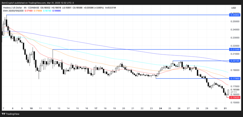 Als deze steun niet standhoudt, kan dit de deur openen voor verdere dalingen, mogelijk HBAR onder de $0,15 duwend voor het eerst sinds november 2024.