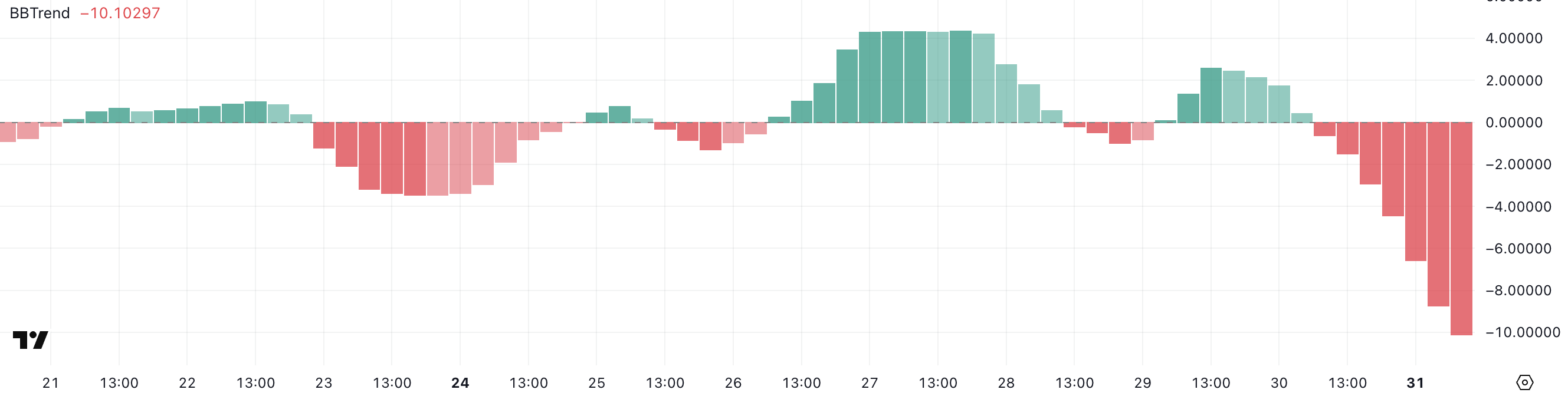 De BBTrend, of Bollinger Band Trend, meet de sterkte en richting van een trend door de positie van de koers ten opzichte van de Bollinger Bands. Positieve waarden duiden over het algemeen op bullish momentum, terwijl negatieve waarden wijzen op bearish momentum.