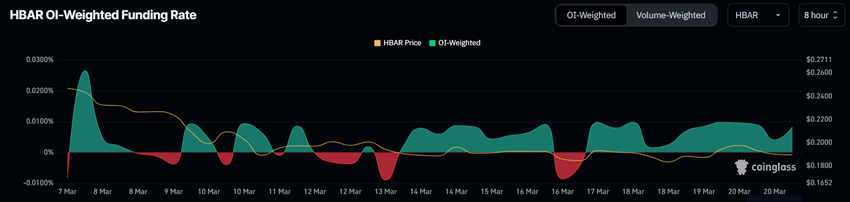 Op dit moment is de funding rate van HBAR positief, wat aangeeft dat longposities de shortcontracten op de markt domineren. Dit suggereert dat handelaren inzetten op een uiteindelijke stijging van HBAR’s koers, in de hoop te profiteren van het herstel. De positieve funding rate weerspiegelt doorgaans het vertrouwen van investeerders, maar de marktomstandigheden en recente koersbewegingen maken het moeilijk voor deze posities om winstgevend te worden.
