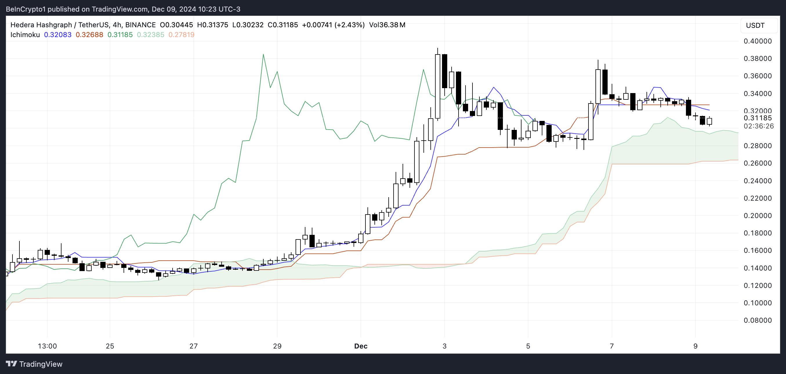 Hedera koers is recent in een sterke opwaartse trend geweest, met de hoogste niveaus sinds november 2021. Dit wordt duidelijk aangegeven door de beweging boven de Ichimoku Cloud. De coin steeg scherp en bereikte een piek rond $0,39, met de koers die boven de cloud blijft, wat bullish momentum aangeeft.