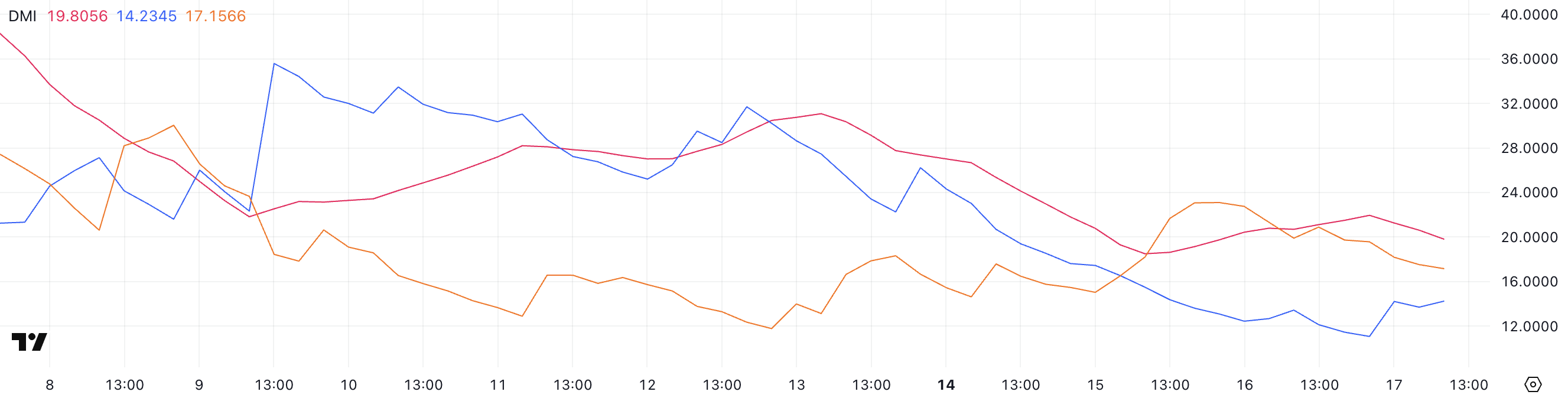 Kijkend naar de directionele indicatoren, is de +DI (Directional Indicator) gestegen van 13,42 naar 14,2, wat een lichte toename in bullish druk laat zien. Ondertussen is de -DI gedaald van 19,89 naar 17,15, wat verzwakkende bearish momentum aangeeft.
