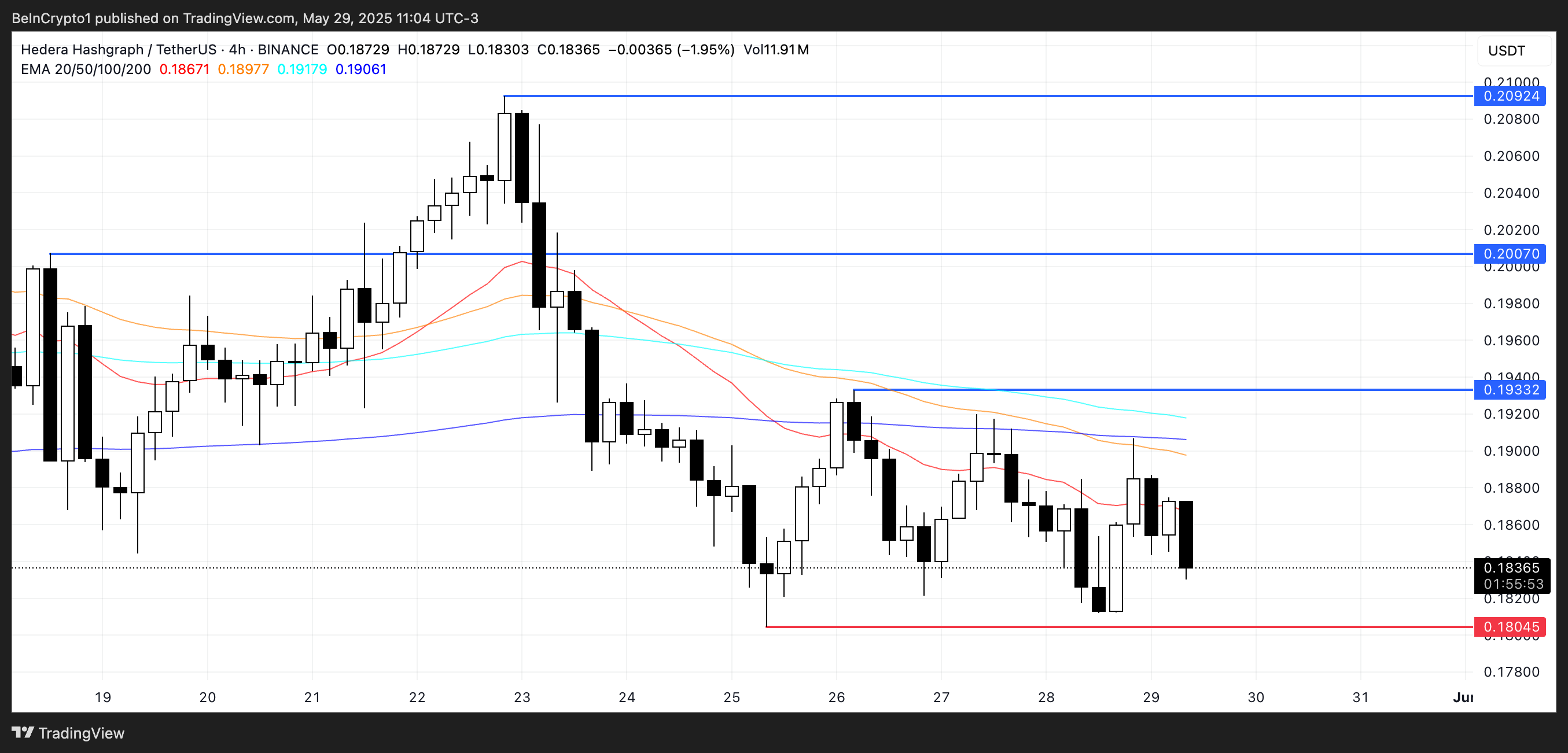 HBAR nadert $0,18-steun terwijl bearish EMA-setup aanhoudt