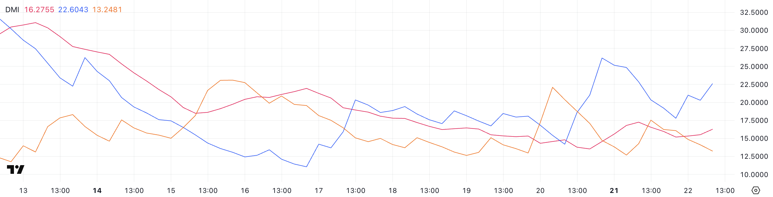 Hedera’s Directional Movement Index (DMI) toont vroege tekenen van opbouwend momentum, met de ADX die stijgt naar 16,27, vanaf 13,54 twee dagen geleden.