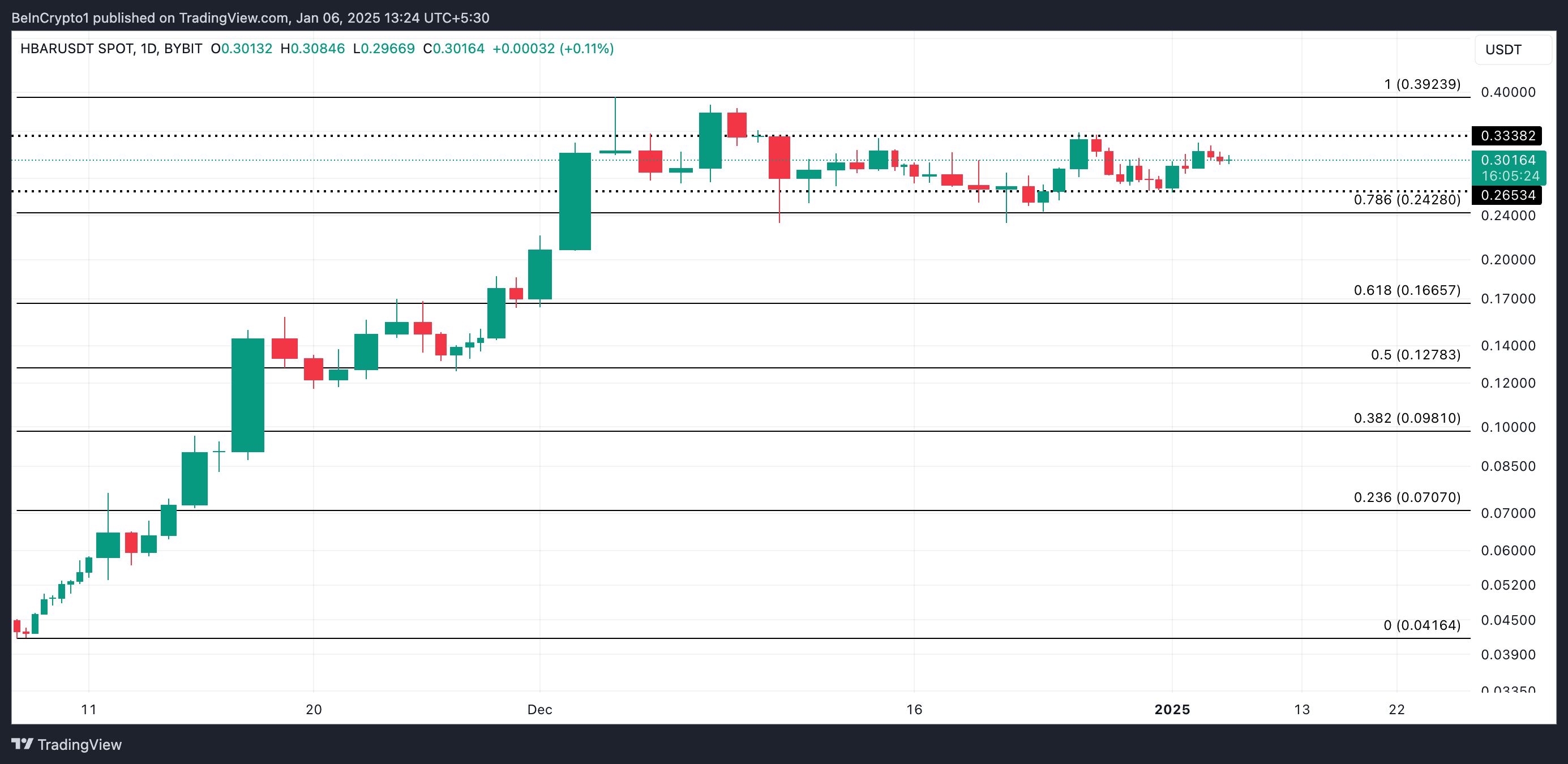 Op de dagelijkse grafiek staat HBAR voor grote weerstand op $0,33. Als de bullish druk aanhoudt, zou de altcoin boven dit cruciale niveau kunnen breken en zijn 30-daagse high van $0,39 kunnen heroveren.
