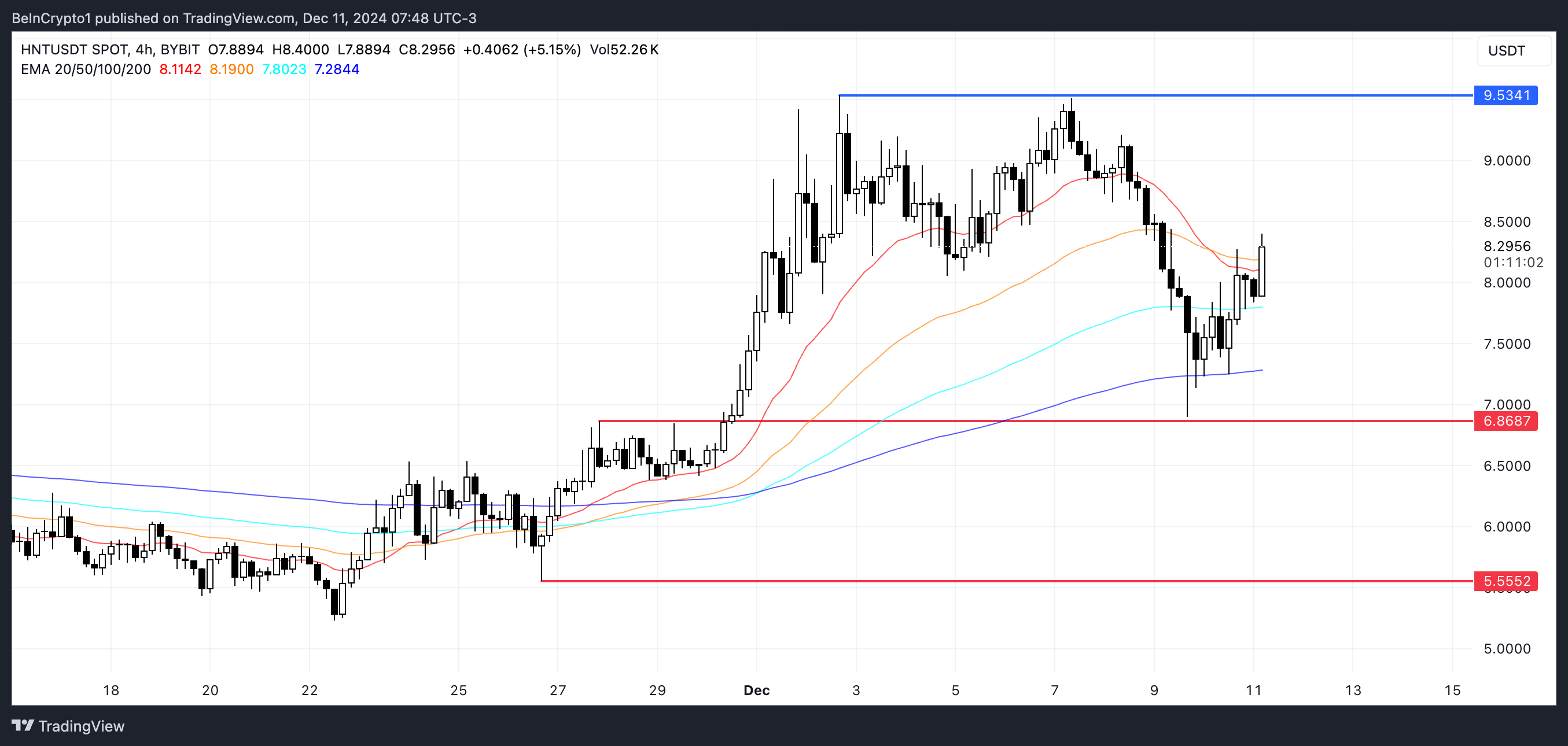 De ADX wijst op een verzwakking van de trendsterkte, terwijl de RSI naar een neutrale zone wijst. Met EMA-lijnen die potentieel voor een bullish crossover laten zien, staat HNT voor een cruciaal moment dat kan bepalen of het stijgt naar $9,53 of kritieke steunniveaus rond $6,86 test.