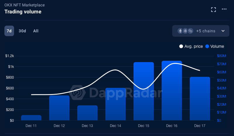 De OKX NFT marktplaats zag meer dan $50 miljoen in volume in de 24 uur die eindigden om 2 PM Hong Kong tijd. De volumes overtroffen populaire rivalen OpenSea en de pro-gerichte NFT marktplaats Blur.