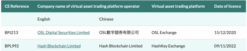 Omgekeerd heeft de SFC licenties verleend aan twee beurzen in Hongkong, OSL Exchange en Hashkey Exchange.