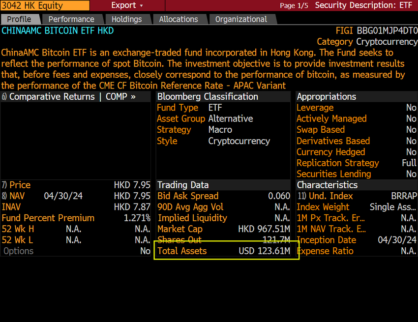 Een lokaal mediakanaal meldde dat de initiële omvang van de ChinaAMC Bitcoin ETF (CAM BTC) en ChinaAMC Ether ETF (CAM ETH) respectievelijk 950 miljoen HKD en 160 miljoen HKD bedroeg. Bovendien onthulden data van Bloomberg Intelligence dat CAM BTC ETF $123,61 miljoen aan totale assets had.