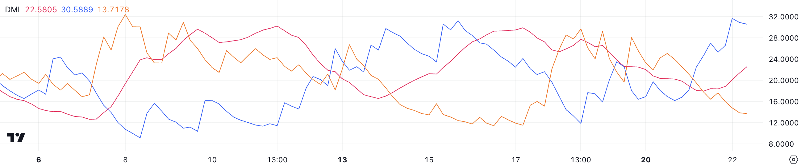 Hyperliquid Directional Movement Index (DMI) grafiek toont een ADX-waarde van 22,5, gestegen van 17,9 slechts een dag geleden, wat wijst op een versterkende trend. De ADX meet de sterkte van een trend zonder de richting aan te geven.