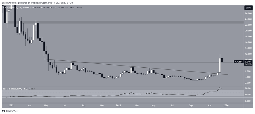 Deze versnelling veroorzaakte een breakout uit twee weerstandniveaus. Op 16 december bereikte de ICP koers een nieuwe jaarlijkse high van $11,90. Dit was de hoogste koers sinds mei 2022.