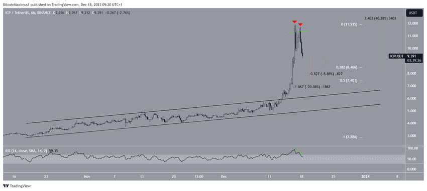 Ook creëerde ICP een dubbele top (rode pijlen), wat wordt beschouwd als een bearish patroon. De dubbele top werd gecombineerd met een bearish divergentie in de zes-uurs RSI. Als de daling doorzet, zal het 0,382 Fib retracement steunniveau op $8,47 liggen. Dat is bijna 10% onder de huidige ICP coin koers.